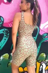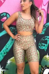 Leopard print fitness top in shades of green and brown, with medium, straight straps that ensure good support and safety for training and performing any type of physical exercise.