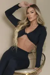 The long-sleeved cropped top in black features a V-neckline and a front knot that accentuates the waist. Made from a lightweight, form-fitting fabric, it's versatile for a variety of occasions, combining style and comfort.