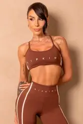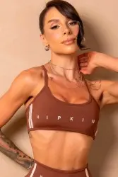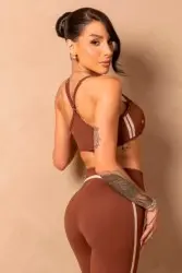 Brown top with nude bias on the sides and adjustable thin straps. It features a snug fit that offers support and comfort, ideal for workouts or casual outfits with a sporty style.