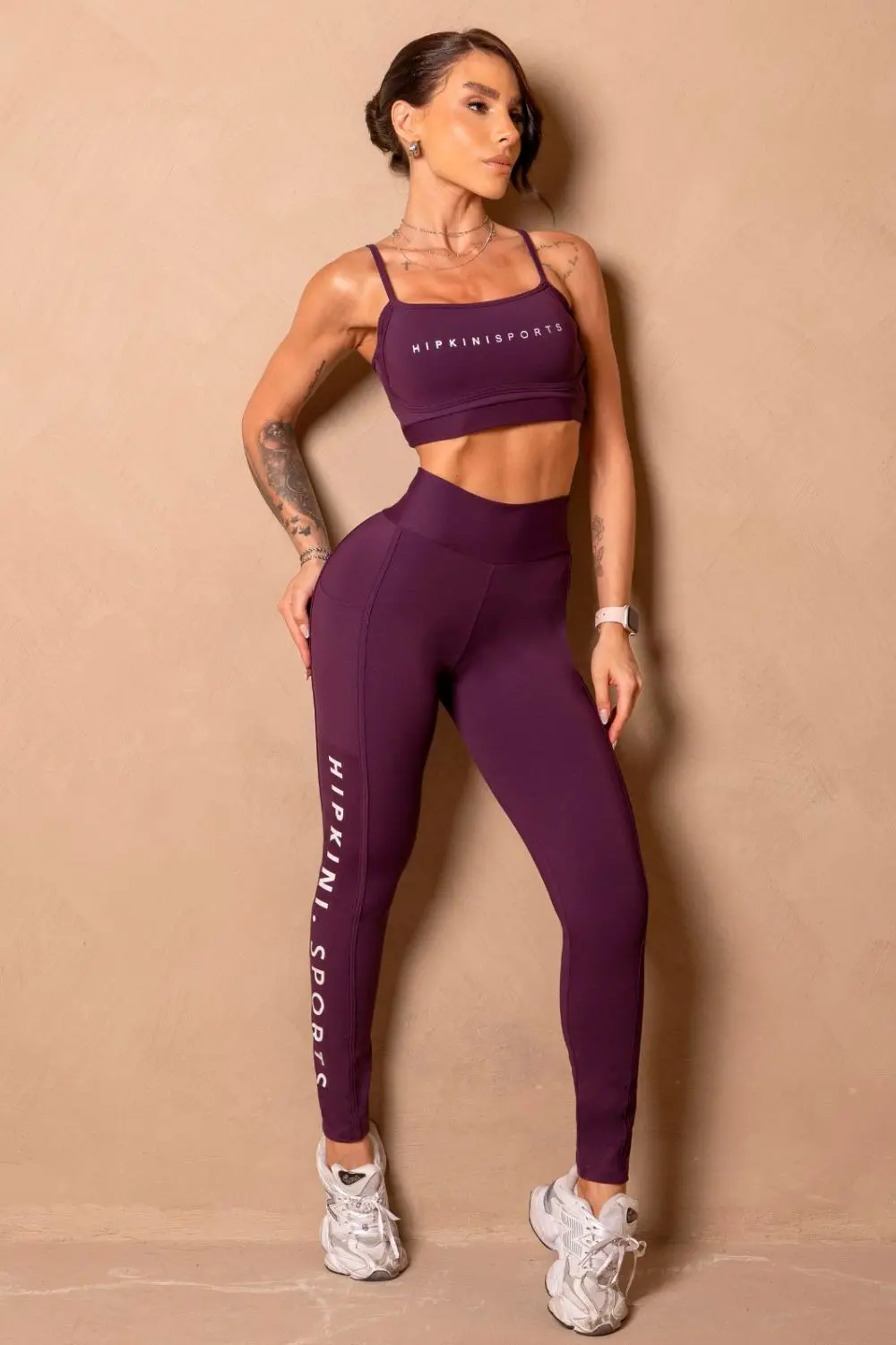Purple fitness top with thin adjustable straps and a straight cut that enhances the bust. Made from firm and comfortable fabric, it offers light support and a soft touch, ideal for workouts or casual outfits. Features a front logo detail for a modern and sophisticated look.
