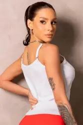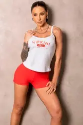 White tank top with thin straps, a fitted and slightly cropped design. Made from ribbed fabric with stretch, it provides comfort and a flattering fit. Features a round neckline and a centered print with the "Hipkini 2011 athletic club" logo in red. Versatile, it can be worn in both fitness outfits and casual looks.