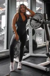 Characteristics: Black jumpsuit with straps on the back joined by a ring, has a high butt.