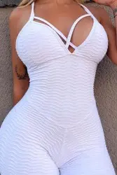 Features: A textured white jumpsuit with a neckline overlayed with crossed straps, as well as an open back design.