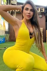 Features: A yellow fitness jumpsuit with a V shaped neckline, an open back design, and additional suspender-like straps on the inner part of the piece, that can be seen through the cut over the bust.