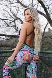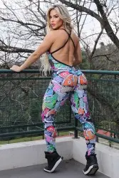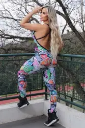 Jumpsuit with a vibrant design and full of personality. Colorful tennis print, with a mix of colors such as orange, green, blue, purple and red. The top has a deep "V" neckline, enhancing the bust, and straps that create an interesting visual detail in the area below the bust. The piece is fitted to the body, highlighting the silhouette, and the pants are long and follow the same colorful pattern, with a tight and comfortable fit. Stretch fabric is appropriate for physical activities or casual occasions.