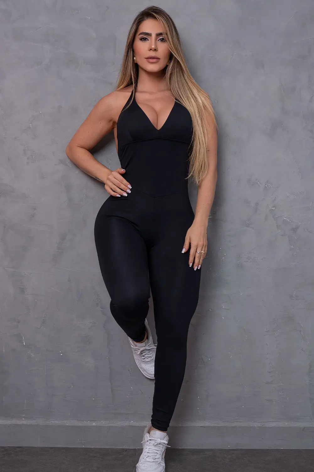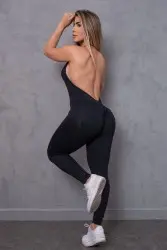 Long black jumpsuit with a V-neck and open back that brings sensuality and freshness to the look, which can be adapted to fitness or casual situations.