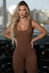 High-compression brown fitness jumpsuit with an anatomical design that enhances your curves. It offers support, comfort and total freedom of movement. The rounded front neckline elegantly highlights your cleavage, while the back has a scooped cut and a central opening that ensures ventilation and a touch of sensuality. The bottom has strategic ruffles on the butt, which enhances the contour with a lifting effect. Ideal for intense workouts or sophisticated urban outfits, it is a versatile, practical and impressive piece.