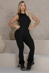 Black fitness jumpsuit, with a body-hugging design, made of high-compression stretch fabric. It has a completely open back, with a low-cut cut that enhances the silhouette. The back has a strategic seam in the center of the buttocks, promoting a “butt-lifting” effect. The legs are long, reaching the ankle, and the collar is high, halter neck style, sleeveless. The design is modern, sensual and ideal for workouts or casual wear with style.