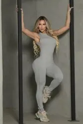 Grey fitness jumpsuit, with a body-hugging design, made of high-compression stretch fabric. It has a completely open back, with a low-cut cut that enhances the silhouette. The back has a strategic seam in the center of the buttocks, promoting a “butt-lifting” effect. The legs are long, reaching the ankle, and the collar is high, halter neck style, sleeveless. The design is modern, sensual and ideal for workouts or casual wear with style.