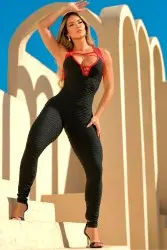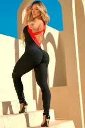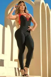 Black jumpsuit with red accents, a fitted cut that flatters your curves, and brocade fabric for comfort and style. Ideal for occasions that call for sophistication and elegance, with a modern and sensual touch.