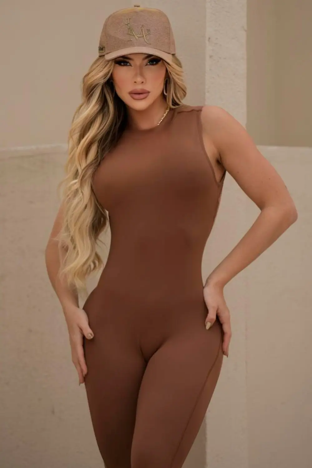 Brown fitness jumpsuit with a fitted and compressive fit, enhancing your curves with a butt-lifting effect. It features a deep side armhole and a scooped back design, ideal for those seeking style and performance in one piece. Comfort, poise, and versatility for workouts or street style.