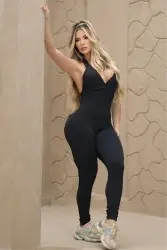 The fitted ribbed knit jumpsuit in black features a halter neckline and open back. The piece shapes the body, highlighting the silhouette.