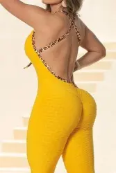 Vibrant yellow jumpsuit in textured fabric that shapes the body, with a deep neckline at the back and straps with animal print detail, bringing boldness and style to workouts or casual moments.