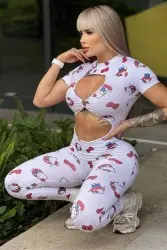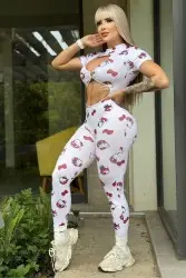 The design stands out for its strategic cutouts at the waist and bust, which feature an elegant central ruching detail for a modern and sensual touch. With short sleeves and long-length pants, it's ideal for those seeking a look that combines comfort, style, and personality for their workouts.