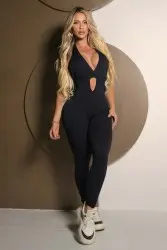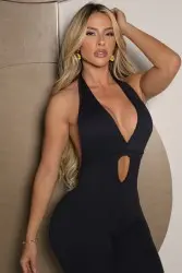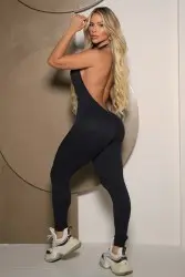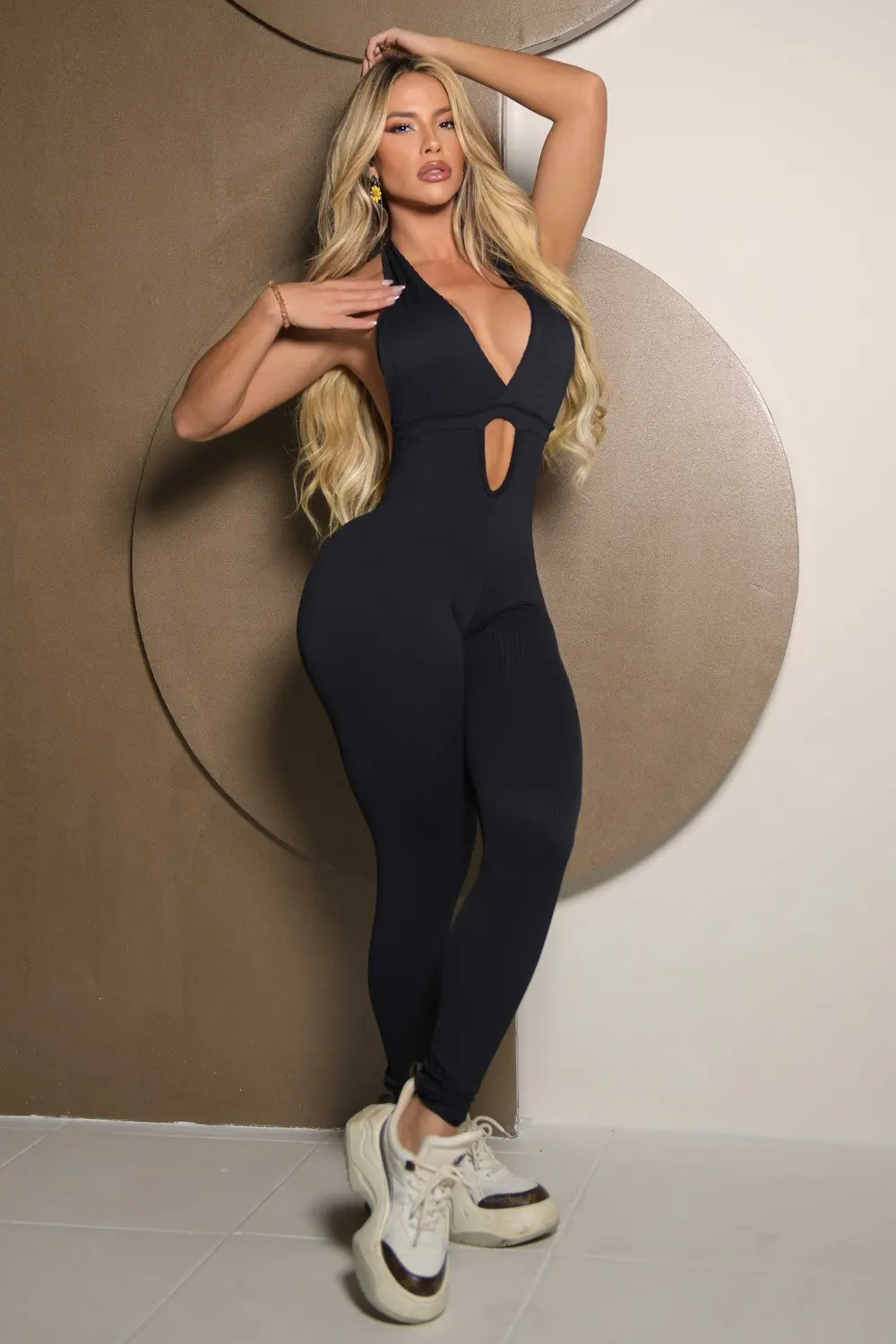 The jumpsuit is made of ribbed fabric, with a fitted fit that enhances curves and provides comfort. It features a deep V-neckline and openwork detailing at the front, adding a modern and sensual touch. The back is completely open and ties at the neck, highlighting the silhouette. The brown tone brings sophistication and versatility, ideal for elegant and contemporary ensembles.