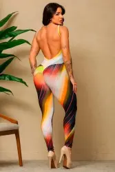 Exclusive design fitness jumpsuit with a multicolored gradient print that flatters the silhouette and elongates the body. Features a fitted design, highly elastic fabric, and excellent compression, ensuring comfort and support. Highlights include the open neckline and back, which bring modernity and sophistication to the look, ideal for workouts or elegant fitness outfits.