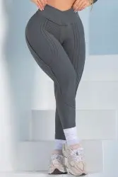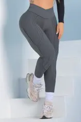 Gray leggings in textured fabric with an anatomical waistband and a curve-flattering design. Striped details contour the body, creating a sporty, modern look. Ideal for stylish, high-performance workouts.