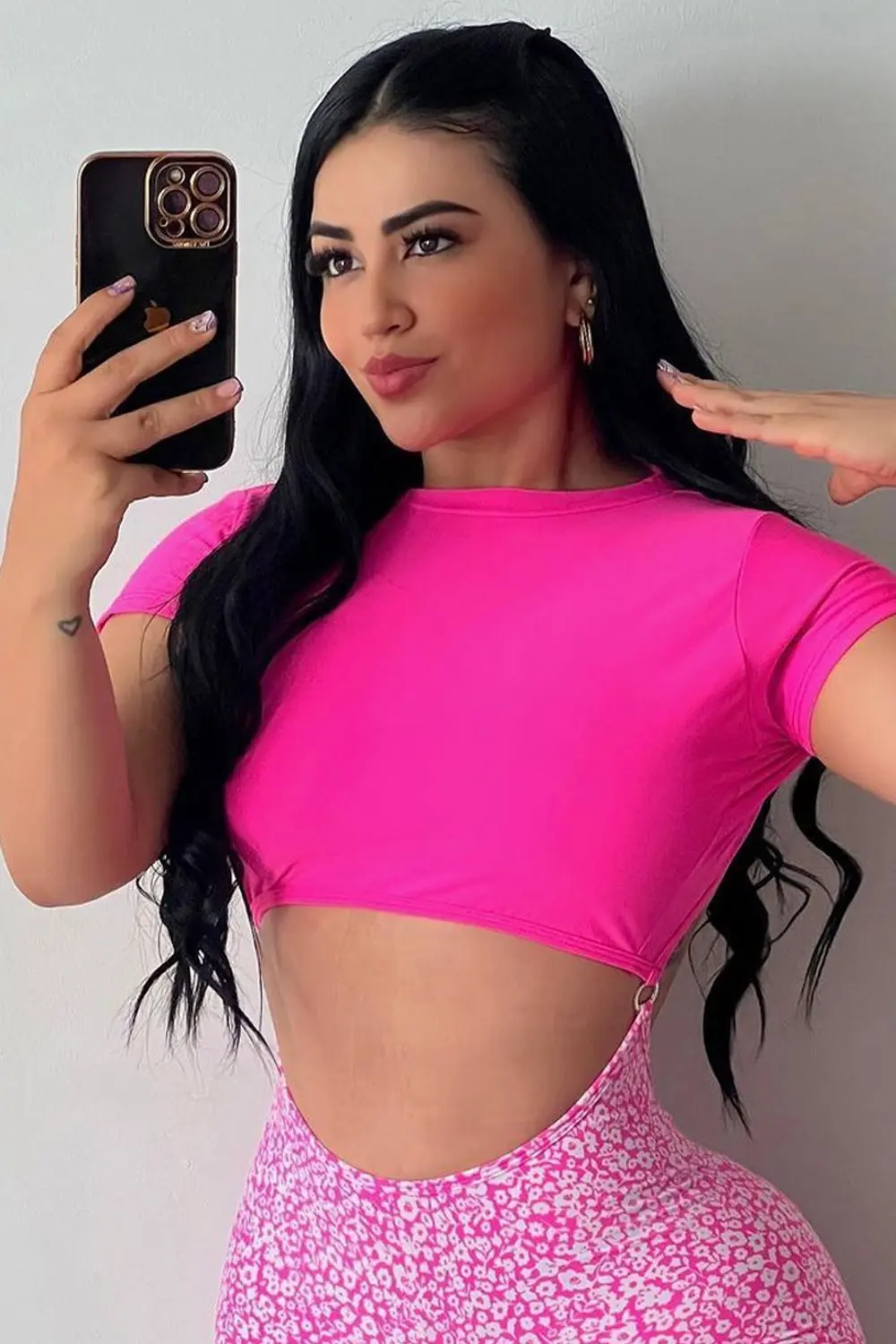Introducing our vibrant Fitness romper - where fitness meets floral fashion! This romper is a game-changer with its playful opening over the abdomen, creating a striking two-part design. The upper section boasts a chic front-only piece with short sleeves, while the lower half blooms with a vibrant pink and white flower print.