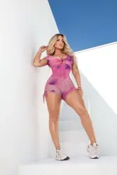 The romper is pink with purple spots in a tie-dye style. Made of textured fabric, it is close-fitting, enhancing the curves. It has a tie at the neckline and adjustable drawstrings on the thighs. Bold and stylish, it is perfect for a striking look.