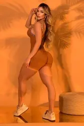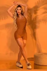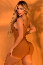 Short shaping jumpsuit with thin straps in an animal print, made from textured fabric that flatters curves with comfort and style. Features a V-neck front and a deep cut-out back, ideal for workouts or casual fashion outfits.