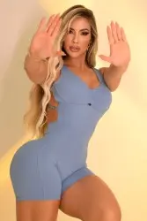 This romper is made from a form-fitting, stretchy fabric that shapes the silhouette. It features a V-neck with discreet ruching at the bust and thin straps that cross at the back, leaving the back almost completely open. The waist is accentuated by the design itself, which elongates and flatters the body shape, creating a minimalist and sophisticated look.