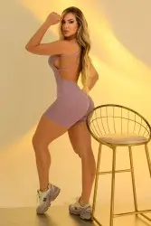 This romper is made from a form-fitting, stretchy fabric that shapes the silhouette. It features a V-neck with discreet ruching at the bust and thin straps that cross at the back, leaving the back almost completely open. The waist is accentuated by the design itself, which elongates and flatters the body shape, creating a minimalist and sophisticated look.