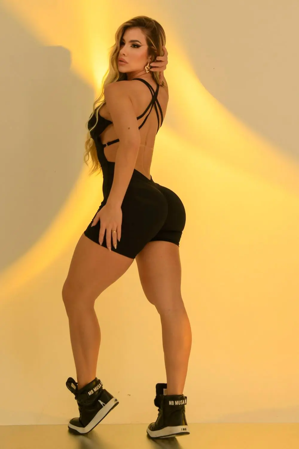 This romper is made from a form-fitting, stretchy fabric that shapes the silhouette. It features a V-neck with discreet ruching at the bust and thin straps that cross at the back, leaving the back almost completely open. The waist is accentuated by the design itself, which elongates and flatters the body shape, creating a minimalist and sophisticated look.
