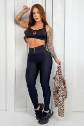 Classic black fitness set featuring a top with a center-cut teardrop cutout, wide straps, and a snug fit that securely accentuates the bust. The leggings feature a high waist and a gold front zipper detail for a touch of sophistication. Versatile, modern, and ideal for workouts with style and attitude.